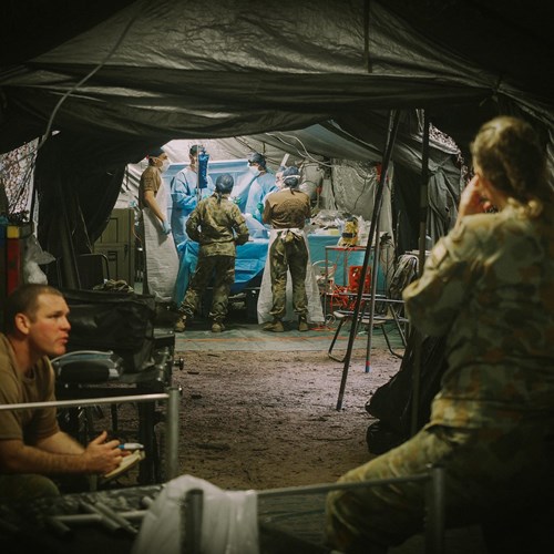 Capt James Savage – Damage Control | Members of a shock trauma team debrief on a training resus, as the light surgical team continue the patient treatment.